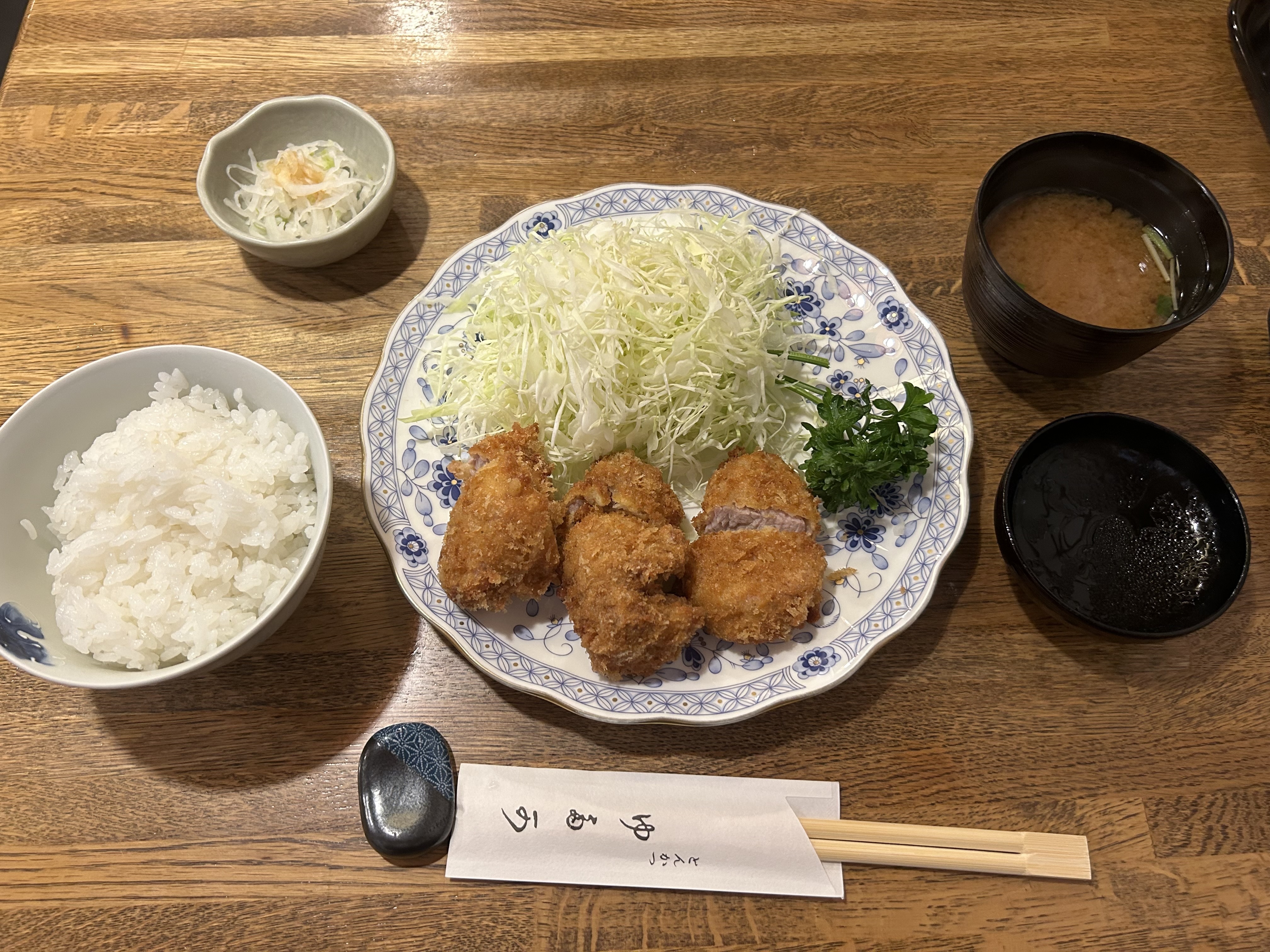 The establishment has a traditional, classic appearance that clearly reflects its long history. However, the interior is elegantly designed, retaining Japanese motifs while being sophisticated and modern. The menu includes individual side dishes, but the highlights are the renowned, top-quality fillet cutlets and pork cutlets. The accompanying cabbage is hand-shredded rather than machine-cut, which enhances its sweetness.