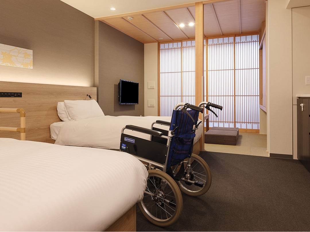 房間走道寬敞,擁有足夠迴轉空間,即使乘坐輪椅的客人也能享有安全舒適的住宿環境。浴室也採用了無障礙的系統式衛浴。