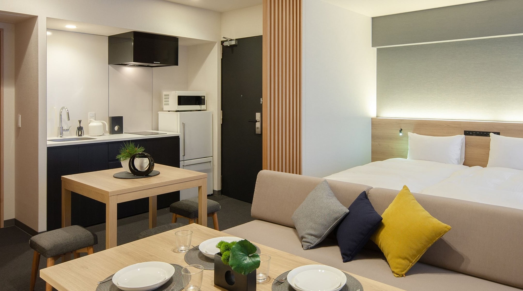所有房間均配備廚房、廚具與餐桌。讓你在旅途中也宛如置身家中般舒適愜意。