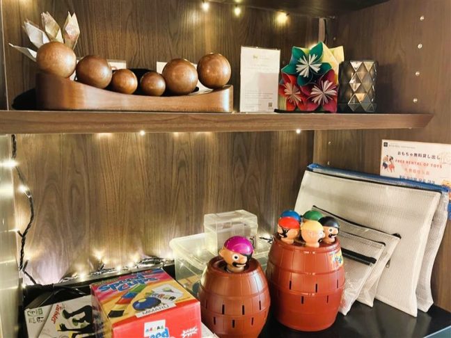 大廳備有劍玉、陀螺等日本傳統玩具與桌遊,皆可免費租借。在旅途中與孩子玩遊戲共享親子時光,大人小孩都開心。