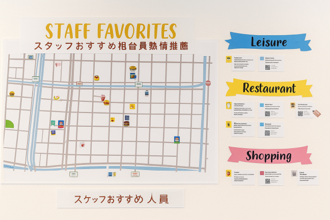 大廳內設有周邊地圖,上面標示了員工們推薦的景點與店家,是住客們隨時可以參考的旅行情報。其中還特別收錄了適合親子同遊的地點,以及可以推嬰兒車輕鬆前往的路線,這些地點與路線皆由飯店員工到實地勘察並嚴選。觀光前先參考一下,能讓旅程更加順利通暢喔。
