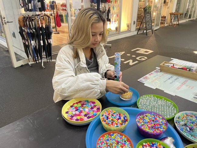 細長的筒狀萬花筒前端有一個透明的壓克力盒,只要將閃閃發亮的零件依序放入其中。 萬花筒的零件並不是隨意放入,而是按照工作人員的指導, 依照指定的順序和數量進行。 整個過程中不需要使用剪刀或膠水,所以即使是小朋友也能安全地參與。 雖然零件的顏色可以自由選擇,但在組裝時完全無法想像完成後的模樣, 這讓人感到更加驚喜。