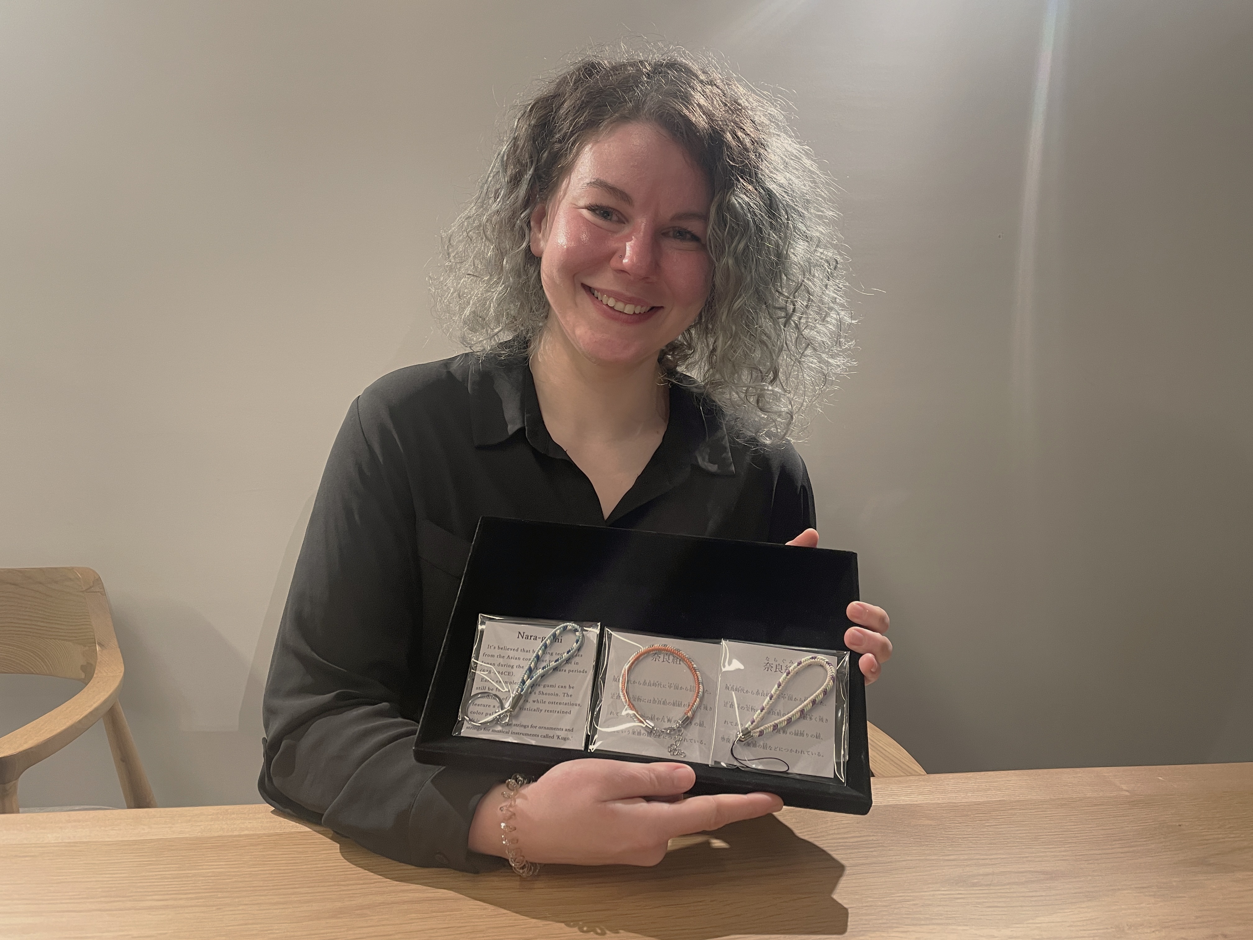 在導覽中,我了解到所有用於組紐的絹絲線,都是由組紐職人親手染色的,這一點令我感到十分驚訝。雖然我最初認為製作组纽會很困難,但在職人的耐心指導下,我能夠輕鬆且安心地練習並進行製作。起初編織時,雖然感到有些手忙腳亂,不過在循序漸進的練習下,編織過程變得更加順利。只要牢記製作步驟,我相信每個人都能順利完成组纽的製作。整個過程中,專注創作時恍如進入心流狀態,竟未察覺時光飛逝,我很享受著這段難得的奢侈時光。