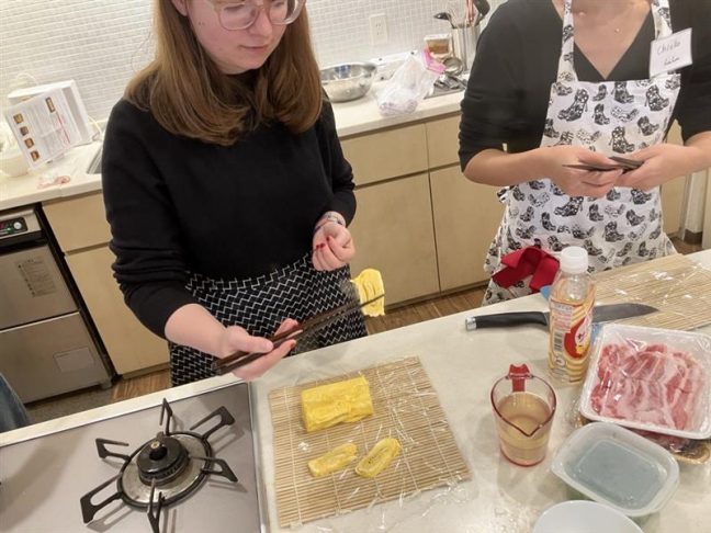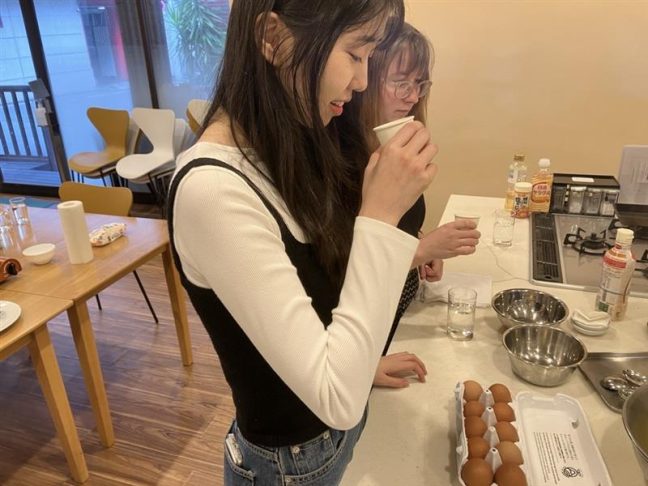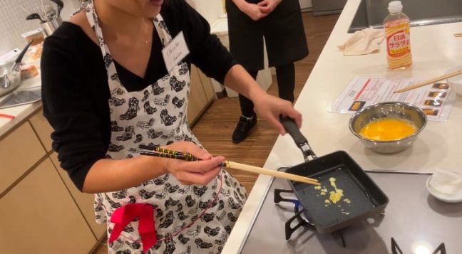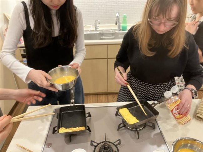 我們也體驗了用平底鍋製作日本獨特的名料理,煎蛋捲。 將蛋液倒入鍋中時如果馬上凝固,那就是熱鍋熱夠了! 像這樣的小訣竅老師也一併教給了我們。多虧了這些訣竅,參加課程體驗的兩位員工都做出了美味漂亮的煎蛋捲◎ 馬上就來試吃我們自己親手做的煎蛋捲吧!