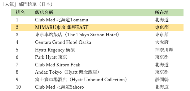MIMARU東京 銀座EAST榮獲日本飯店「人氣類別」第2名